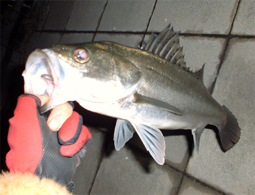 こんなとき何処に釣りに行くかぁ・・・ もうこんなときに行くポイントもなくなった、 「ソーラスの馬鹿ヤロォーーーーーー!!」 しかたがない、いつもの路駐OK、釣りもOKなお気軽ポイントへ 見事に水面も穏やか・・・ 「あぁ~あ」 遠目の隠れ根狙って、110フルキャスト ここで、こんな時合いでこんなルアー投げるかぁ~ 数投したところで 「ゴツッ!」 「ゲッ!きたぁ!なんでっ!?」 こんなとこでこんな時合いに、110かぁいっ! 「おぉぉぉぉぉ!こんなのアリ!?」 50UPのナイスサイズ、マジ釣れちゃうの! 感じで、ウキウキしながら寄せて、抜き上げようとした瞬間 「バシャ!!」 「バレたぁ!!マジっすか!?なで?なで?○△■×」 フックが3本も付いているのでバラすなど考えていない 「・・・・・」 その後ヤル気もうせ、電話しながら現状報告・・・ 「こんなとこで出ると思ってなかったよ」 当然キャストを続ける 「きたっ!」 電話しながら、キャストするとなぜかヒットする 「また、きたよぉ~、なんでこんなとこにいるの?」 など喋りながら巻いていると 「フッ・・・・」 「あら?またバレたぁ?・・・・」 フックが多くても関係ないようである 電話を切り、今日は諦め帰りながらのながらキャスティング 「ゲッ!またきたぁ!!」 これまた途中で 「フッ・・・・」 「ケッ!馬鹿にしやがって」 討ち死に・・・3ヒット、ノォ~ゲッチュ! ゲームには負けたが、 ルアーを喰わしたんだから人間の勝ち! 「私は魚に勝った!!」 そう自分に言い聞かせて、テクテク・・・・と車に戻る こんな時合いにこんな平凡なところで110で出るだぁ~ 今年は魚が多い 今日は午前中、右腕が硬直しシビレがでてきた。 「雨かぁ」 やはり雨が降ってきた、こうなると仕事もヤル気がでない。 仕事も早々切り上げ、雨も上がっていたので釣具屋に寄って帰ることにした。 「おっ!リップレスがある!一個750円!!ラッキー!!」 当然、買占めて帰宅。 雨も上がって、思ったほど冷え込みもないので、前回の線香臭さを魚の匂いに変えるため出撃! 今日は何が何でも陸に上げて1ショット撮りたいところだ。 軽い雨なので、濁りも入ってちょうどいいかと思い、キャストするもアタリすらなし・・・シブい・・・マジシブ とりあえずロッドを置いて、一服( ̄(エ) ̄)y-°°° 気分転換に電話をして・・・ あーだの、こーだの話ながら、水面を見ていると 潮目に変化が・・・よさげっぽいんで即行移動しキャスト! 「クィッ」 小さいアタリ、抵抗も少ない 「小さいかぁ」 と思いきや、一気に突っ込まれる 今日は必ず捕ると7ft、ULのロッド+CD5だぁ! ロッドがのされる 「ヤバッ!ボラかぁ」 と思いドラッグを緩め、突っ込みをかわしながら慎重に寄せると シーバスだったよ~ん 「おっ!ナイスじゃん」 52cm、やっと1ショットが撮れたぜぇい。 カシオのGV-20、防水、耐衝撃タイプの5年物、ちょーー高画質200万画素 をオークションで安く買ったので、なんとか1ショット撮りたかった。 ここからは気楽だ!ポイントを替え買ったルアーを使うことにした。 3投目でナイスヒット~~!! 58cmゲットで納竿で~す 90分で2バイトはシブぅ! でもゲットできたからよかった、よかった 気圧の変化か、天気が悪くなるのかなんだか、足が痛いぞっと